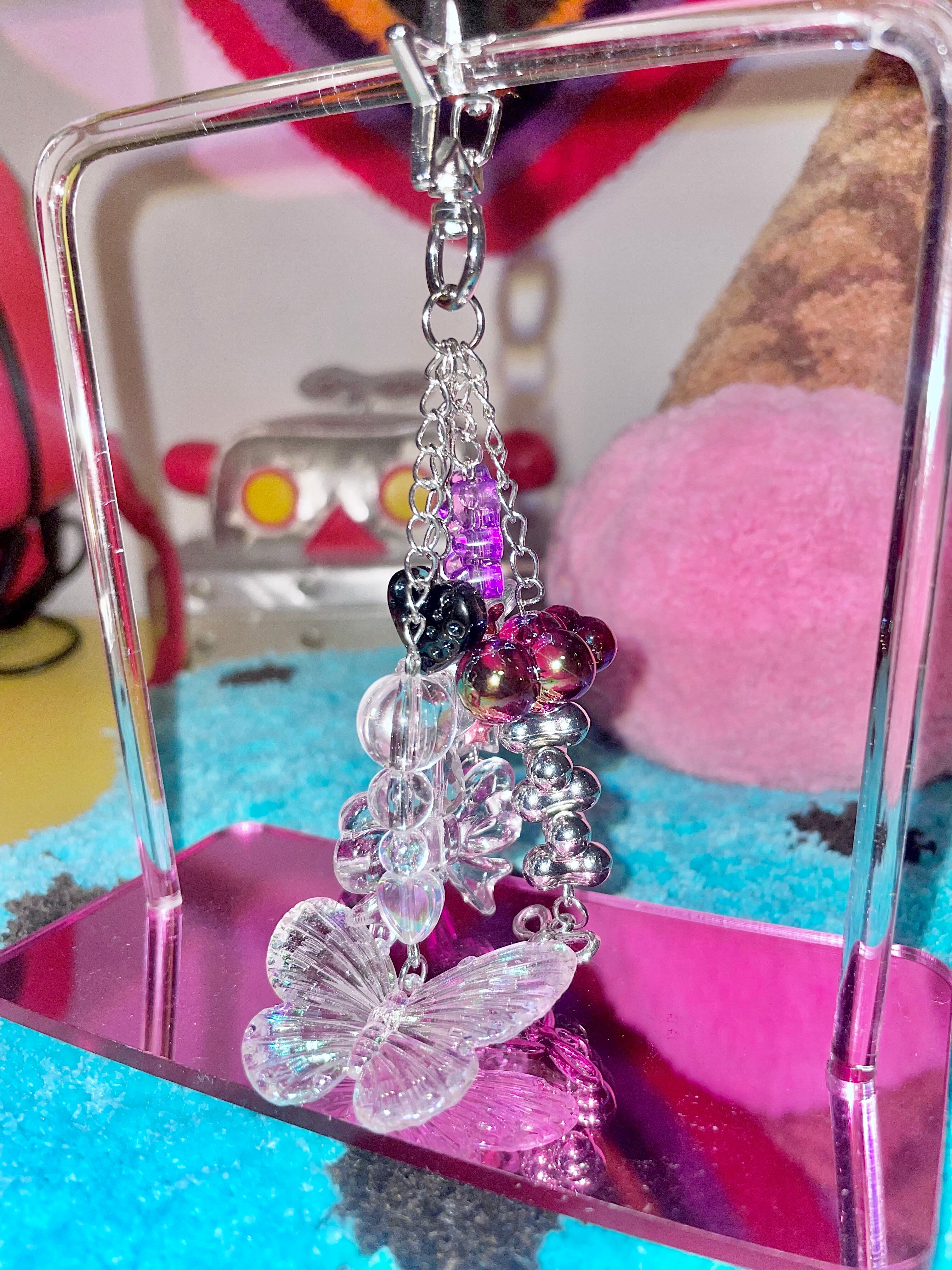 赤紫の独特な色合いが醸し出すダークな雰囲気が魅力的なこのキーホルダーは、クールながらもキラリと光るクリアパーツがアクセントとなり、個性的な印象を与えてくれます!
